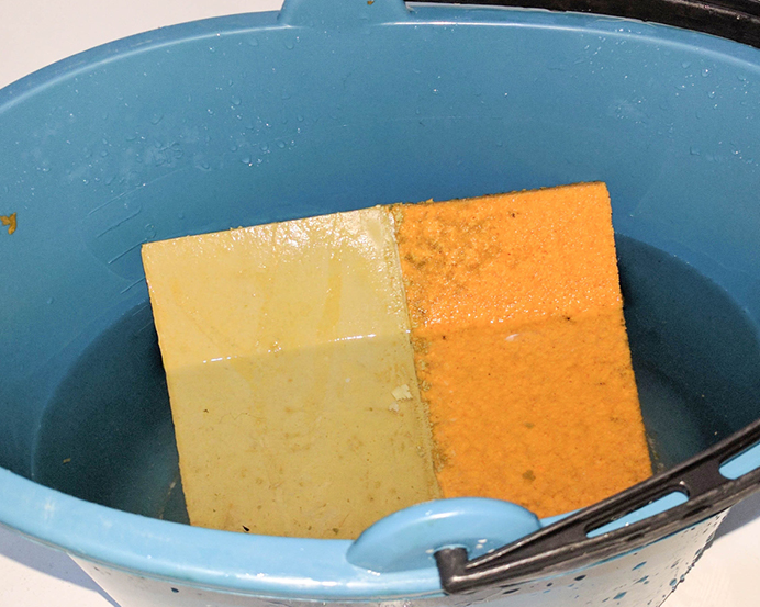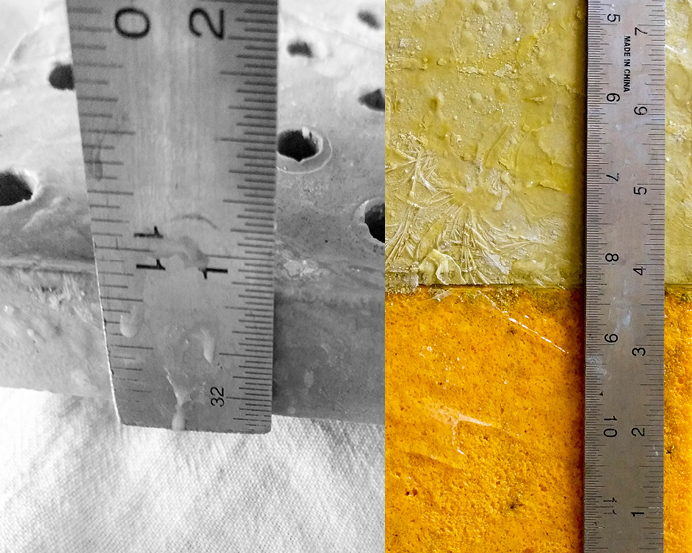 Sidewalk panels can perform poorly in temperate climates, where they undergo extreme hot and cold seasonal, or diurnal temperates. The Temperate Climate test was conducted to understand the impact of physical weathering on polysulfide rubber and typical sidewalk cement. In the test, each sample was immersed in a cold bucket of water for 12 hours, allowing maximum water infiltration, followed by subjecting the panels to freezing temperatures (19F). Material changes were observed and measured, and they are documented below.
