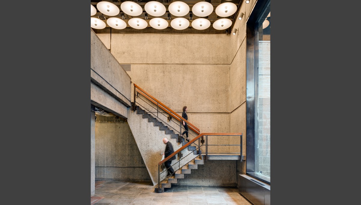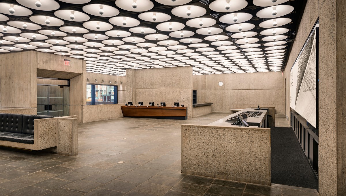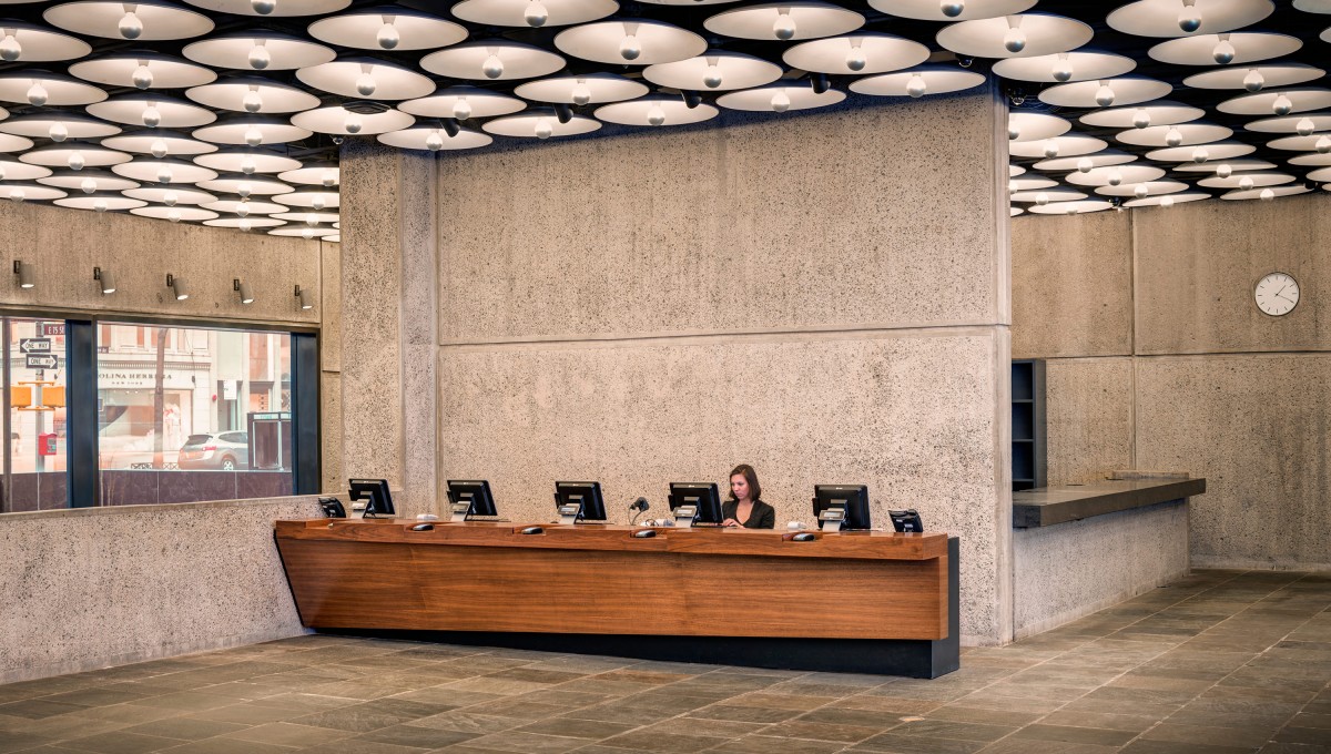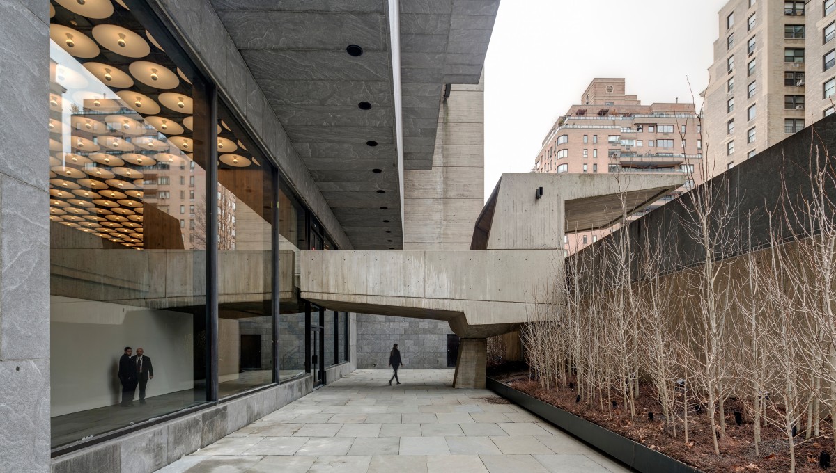 The restoration was approached as Breuer himself would have, carefully preserving the authentic patina of aging materials and allowing visitors to understand and appreciate the building's evolution over time. Planning for the lobby focused on enhancing both circulation and the visitor experience. Retail is minimized and visitors are provided with free access throughout the lobby and lower level. A new, specially designed ticketing desk and ticketing kiosks help to minimize waiting times for entry. Restoration of the public interior spaces and exterior Sunken Garden was undertaken with a consciously conservative approach. Focus was given to restoring the building's signature attributes, including concrete walls, bluestone floors, bronze fixtures, wood handrails, and lighting, carefully distinguishing patina from damage and reserving gentle, targeted cleaning for areas that suffered soiling and damage. Inappropriate or obsolete interventions made after 1966 have been removed and new interventions are limited, contemporary, and capture the spirit of Breuer's aesthetic and intent. Discreet contemporary elements – all inspired by Breuer's use of sculptural forms and natural materials – complement the restored interiors and establish a contemporary Met presence.