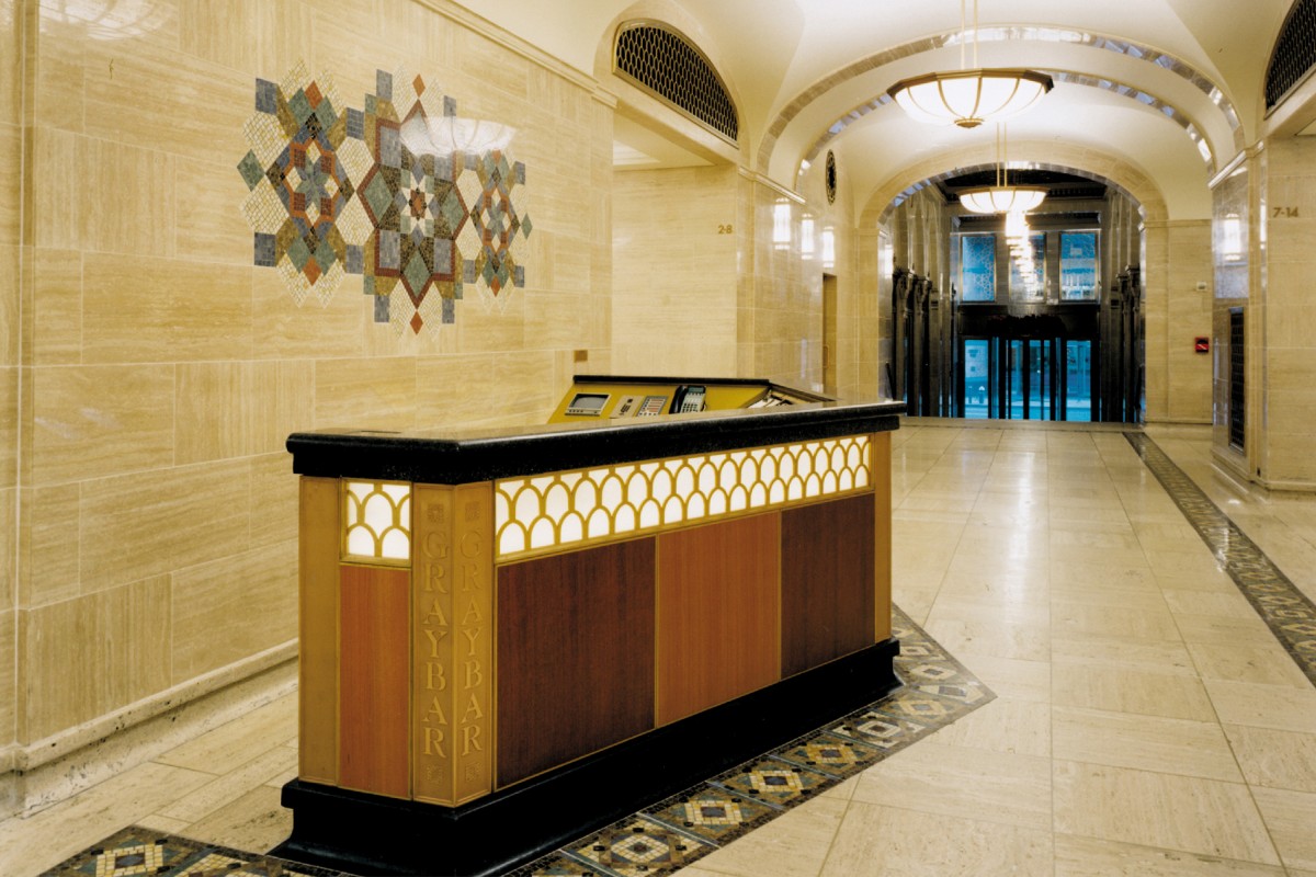 Built in 1926, the Graybar Building is a 31-story building with an exuberant Art Deco exterior and ornate interior lobby. Located adjacent to Grand Central Terminal with direct lobby access to the station, the building features retail establishments along its Lexington Avenue streetfront and within its lobby corridors. BBB's work on the exterior of the building involved the design of monumental bronze, glass, and granite storefronts, a new entrance, and a new canopy. The interior work focused on the restoration of the lobbies, vestibules, and corridors, including the decorative, vaulted ceilings, mosaic flooring and wall treatments, ornamental bronze grills and doors, and vitrines. BBB also designed a state-of-the-art information desk in cherry wood, bronze, and polished granite that stylistically complements the building's 32 reconditioned elevator cabs.