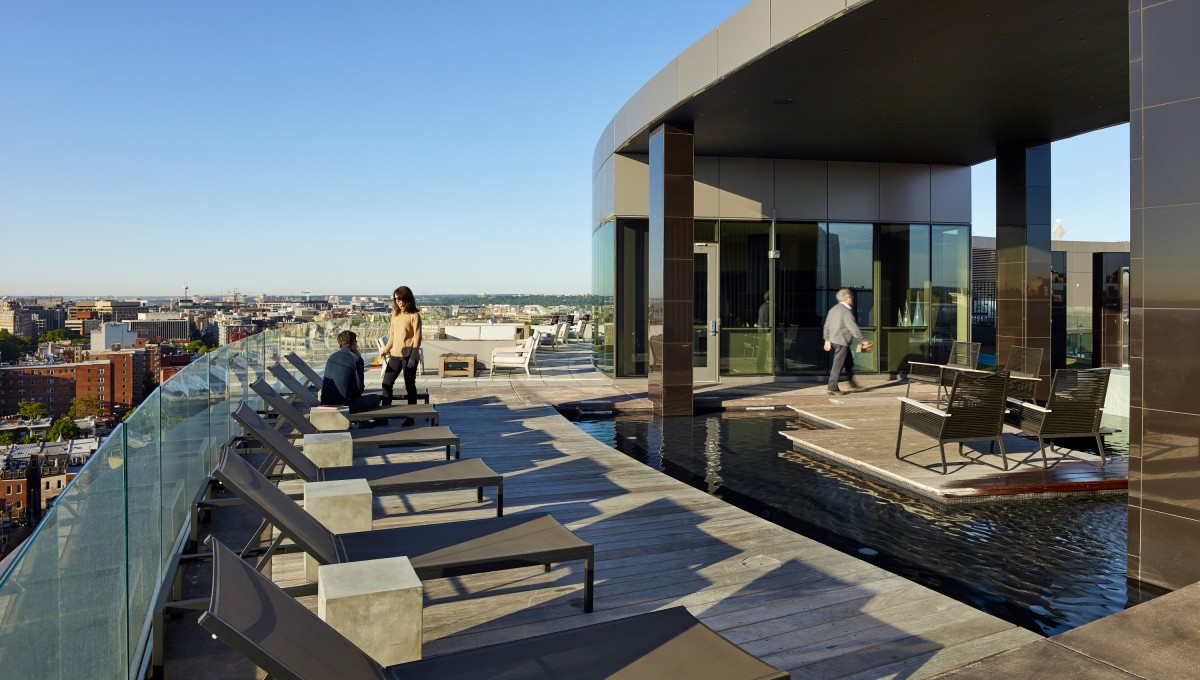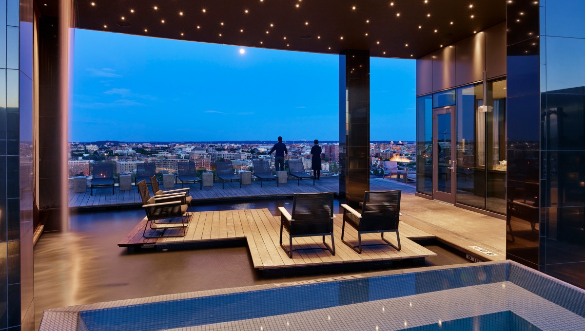 Inspired by the sculptural expression of the historic hotel building, the goal was to complement the original architect's art form in a manner that also responds to the sensitive historic context. The sloped site's irregular shape called for an addition that carefully harmonizes with the geometric quality of the hotel and respects its height and scale. The glass facade is an intentional contrast to the concrete grid-work of the existing structure, while its semicircular form responds to the hotel's double arc, creating two primary open spaces: the interior hotel courtyard to the north and the residential terrace to the south. Expansive views of the city are maximized with rooftop amenities including an indoor "Great Room" and multiple outdoor terraces and pool. A series of ground floor lounges and activity rooms create communal and intimate spaces, allowing residents to socialize with neighbors or relax in privacy. Constructed in 1965, the Washington Hilton is one of DC's most important examples of the expressionist mode of mid-century modern architecture. As part of the project, BBB successfully advocated for the hotel's designation as a historic landmark.