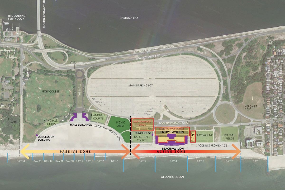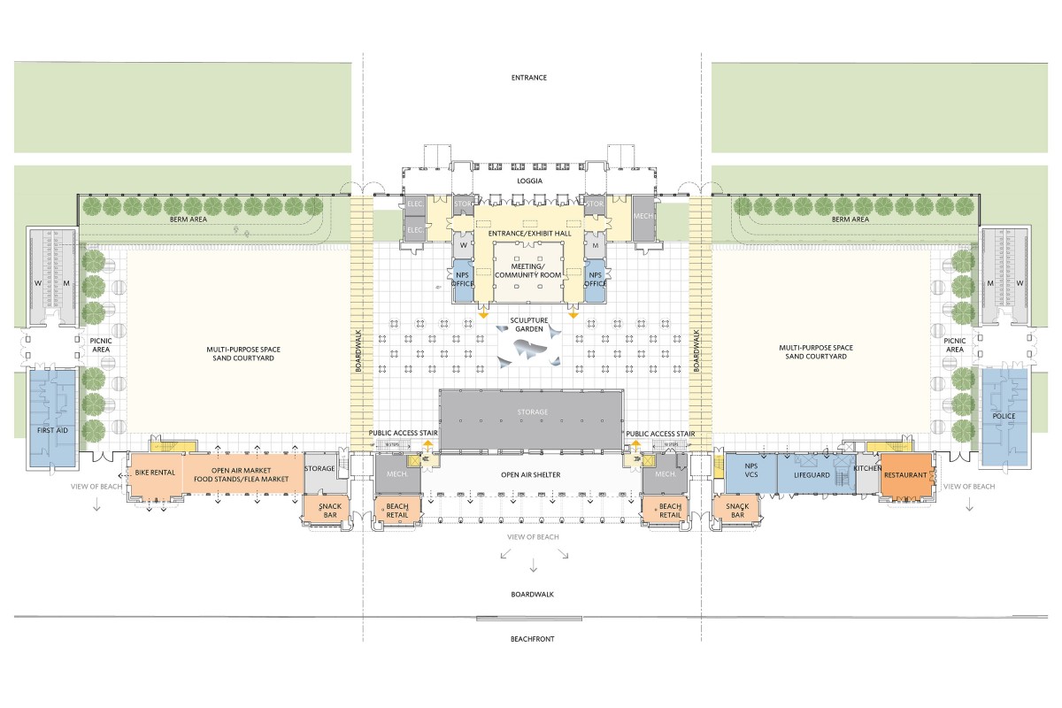 The Jacob Riis Bathhouse was originally constructed in 1932, and its eclectic design contains Byzantine, Moorish and Moderne influences. BBB was retained to prepare a master plan that included alternative public and private uses for the buildings and open spaces, such as a restaurant, snack bars, meeting rooms, community facilities, beach retail outlets, National Park Service offices and a visitor contact station. The work focused on new, historically sensitive windows, doors, and storefronts to complete the exterior shell rehabilitation; a new courtyard design with paving, trees, lighting, and historical elements; and the rehabilitation of the Entry Pavilion, which presents a new "front door" to the complex. The Pavilion includes public meeting spaces, offices, and restrooms, in a rehabilitated, air-conditioned, historically derived interior. In the aftermath of Superstorm Sandy, BBB developed a series of alternative Resiliency Plans to guide the repair.