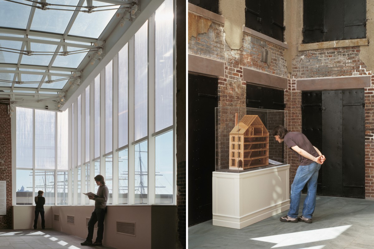The South Street Seaport Museum occupies the upper four floors of the restored Schermerhorn Row block in lower Manhattan. BBB developed a master plan to organize the various components of the museum around a new central court located in the core of the block, and a new escalator provides access to the upper-level museum spaces, which illustrate how maritime social history has impacted the growth of the city. The new exhibit spaces are located within the historic fabric of the mid-19th-century structures, and a 6-story structure is planned for the southeast corner of the block to contain major exhibit space, galleries, and a members' lounge, all with waterfront views. The building's design features a sophisticated, double-glass skin fitted with an automated louvered sunscreen system that reduces the building's energy consumption by maximizing indirect daylight filtering into the interior while minimizing direct solar gain.