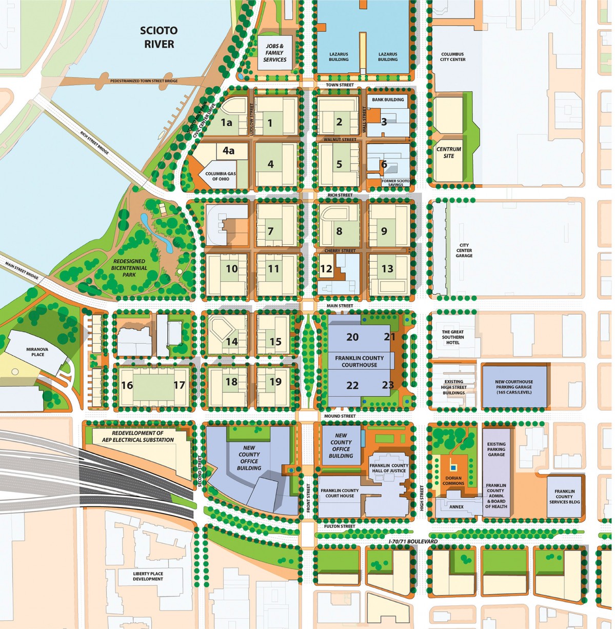 BBB‘s master plan for the 23-block RiverSouth area envisions the revitalization of a district dominated by parking lots into a neighborhood characterized by a variety of housing types, a mix of historic buildings and new architecture, and redesigned streetscapes and open spaces, creating strong links to the waterfront and surrounding neighborhoods. Complementing numerous initiatives and developments that are revitalizing the downtown of Ohio’s capital city, the plan coordinates other major projects in the immediate area including the Scioto Mile riverfront park, the reconstruction of the I-70/71 freeway, and the new Franklin County Courthouse.