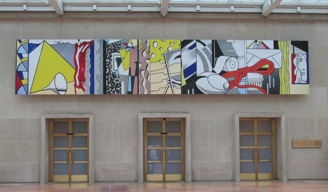 The Lichtenstein painting is displayed above the original Virginia Avenue entrance doors (now the threshold between the Diplomacy Center addition and the historic building), where the words “War Department” were once inscribed.