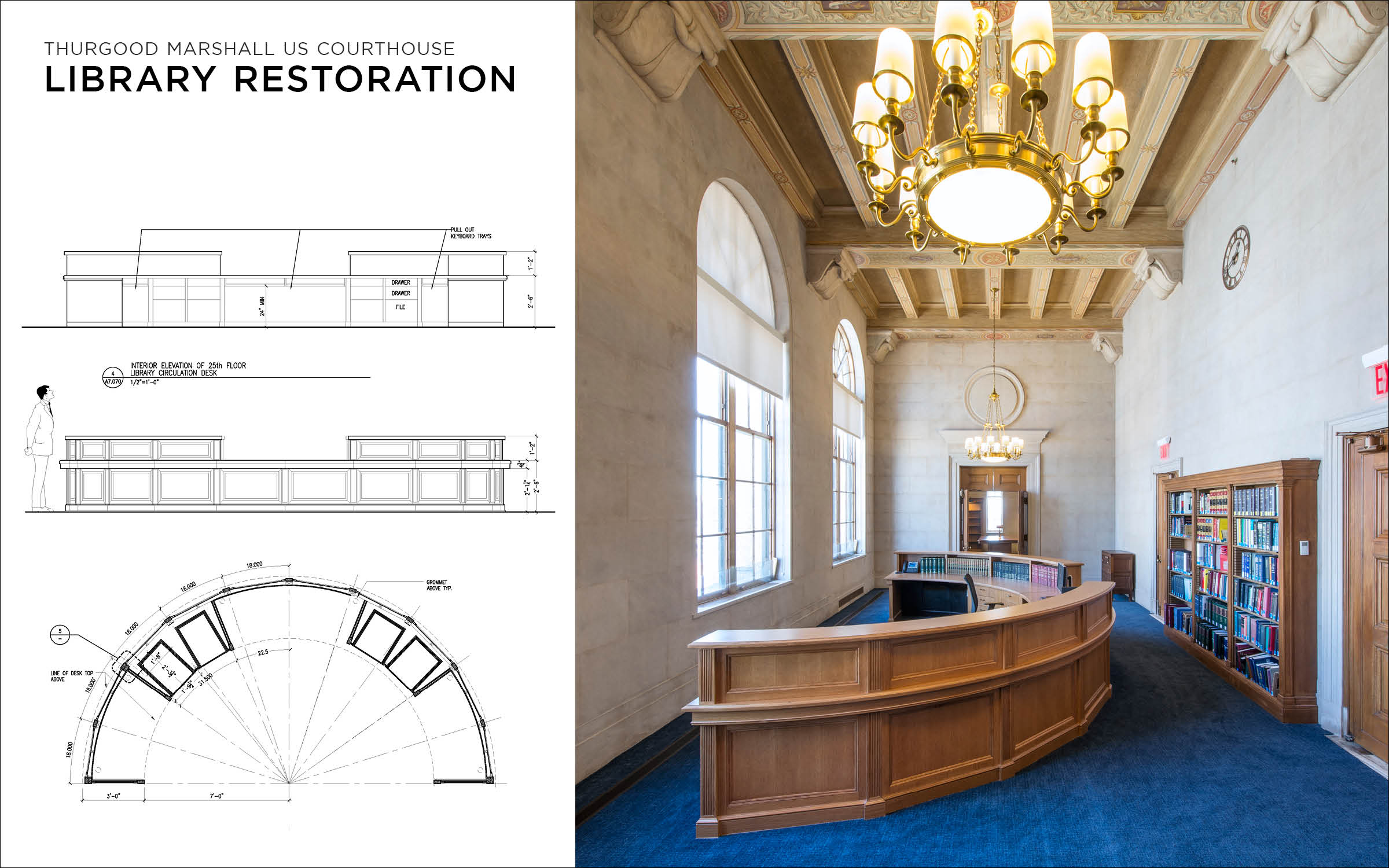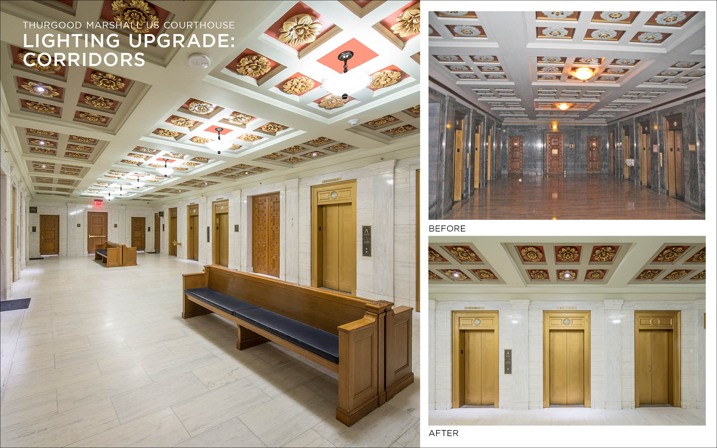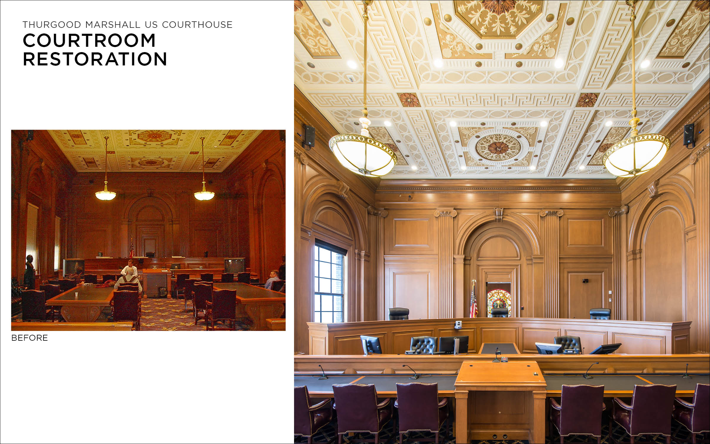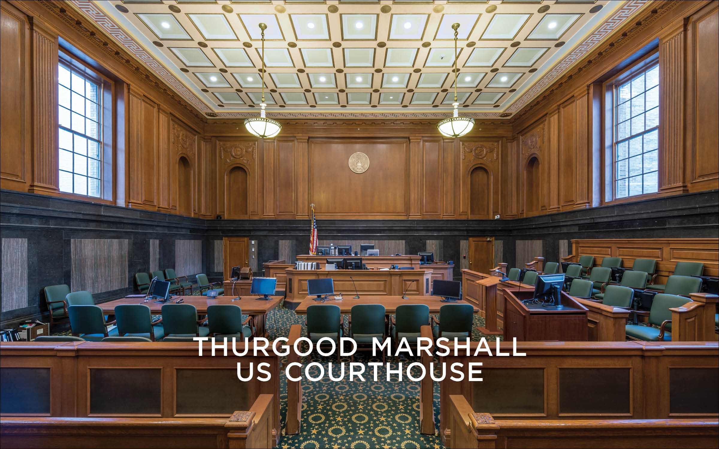 The distinctive gilded pyramidal roof of the Thurgood Marshall US Courthouse shines with new luster these days. Following a comprehensive interior and exterior renovation and restoration, the architectural landmark and preeminent symbol of the Federal Government (site of the famous Alger Hiss and Rosenberg trials) has been revitalized for life in the 21st century and beyond.