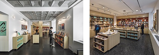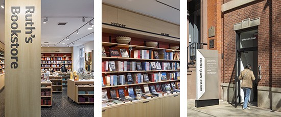 Located at the eastern end of the lobby, Ruth’s Bookstore—a gift of Ruth and Sid Lapidus—supports the Center’s mission through a curated collection of books for public perusal and purchase. Ash wood shelving and display tables create a light and welcoming retail space, while integrated signage designed by LVCK contributes to the Center’s new graphic identity.