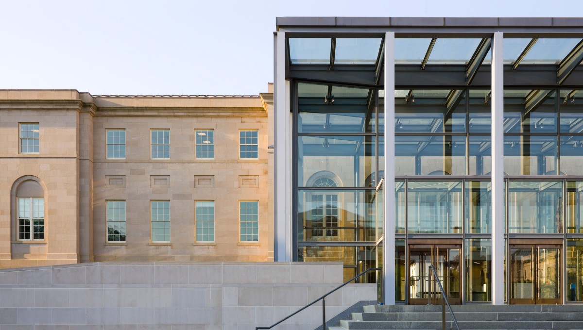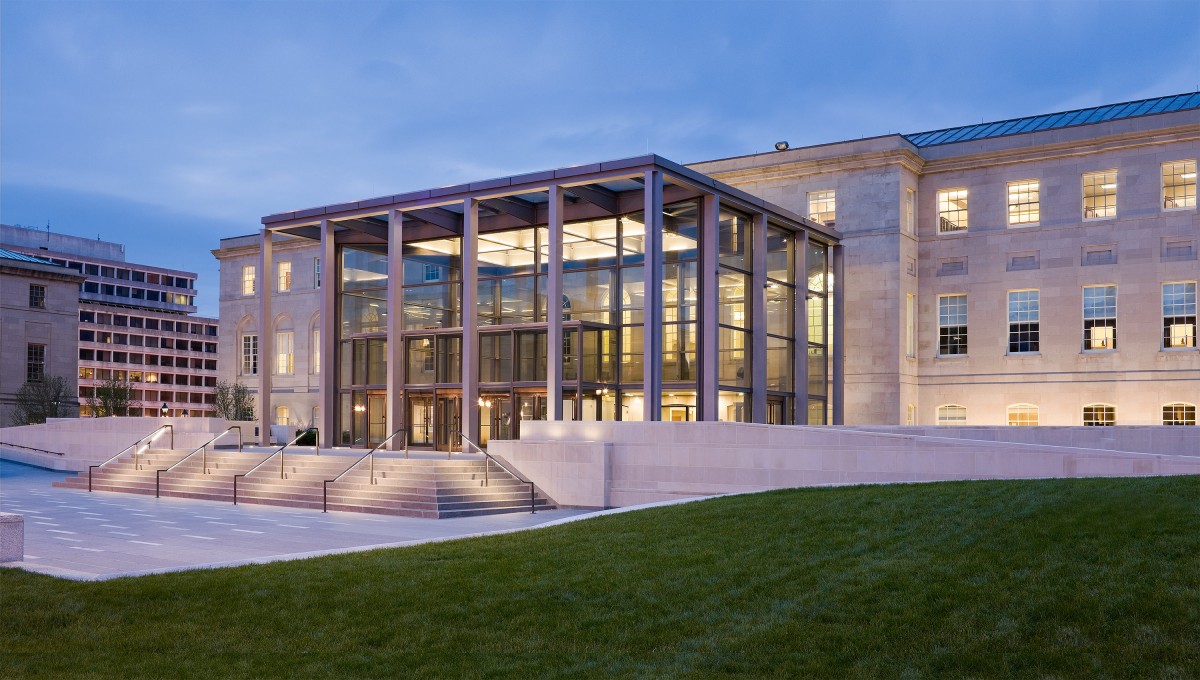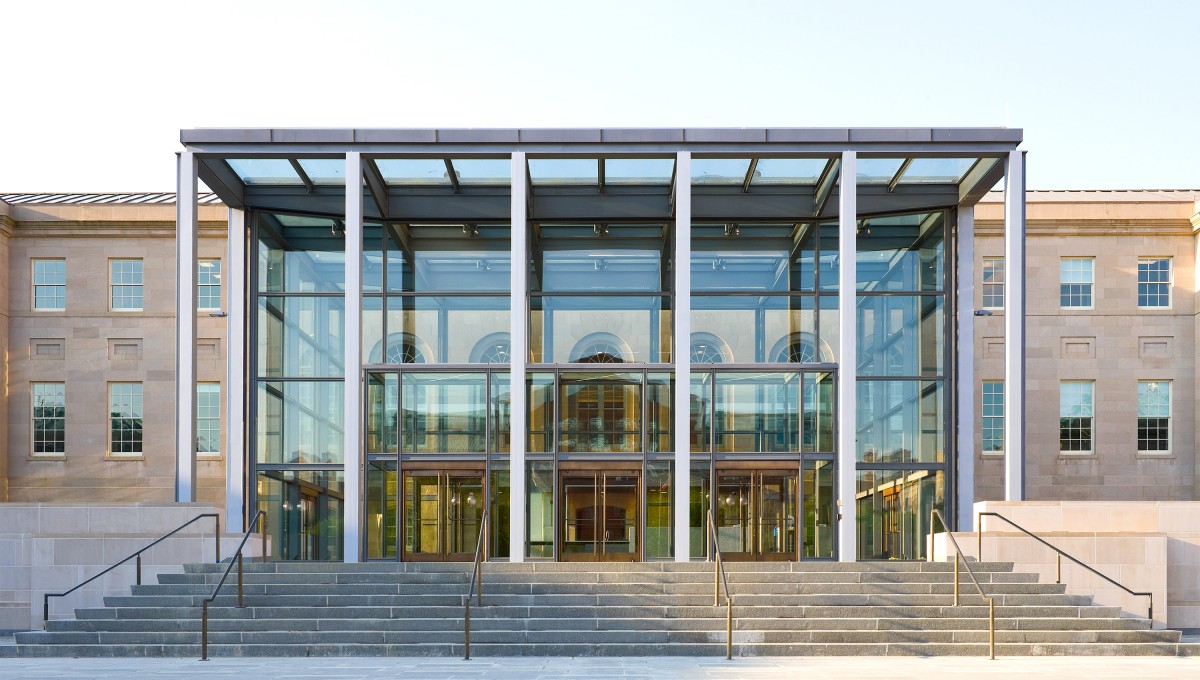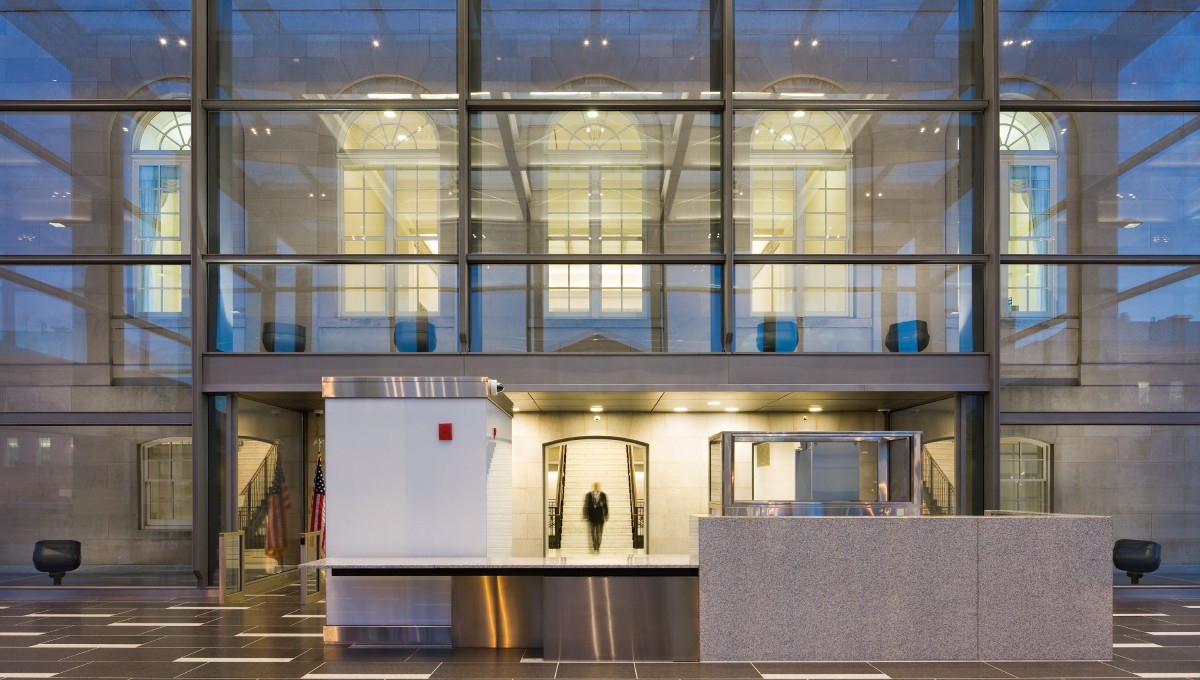 Originally designed by George Hadfield in 1820 to serve as Washington’s City Hall, the Historic DC Courthouse is a National Historic Landmark and a prominent structure on Judiciary Square. BBB’s restoration and expansion prepares the building for 21st-century use. Enhanced facilities, including a ceremonial courtroom, reception spaces, and attorney conference rooms are located below grade to minimize impact on the historic interiors and façade. The addition of a new ceremonial courtroom beneath the grand front portico presented complex engineering challenges. Crews constructed a steel frame onto which the weight of the portico was temporarily transferred using hydraulic jacks. BBB’s design features a new, modern pavilion that is oriented toward Judiciary Square on the north and serves as the main entrance. The entire building is now ADA-compliant with “invisibly” modernized mechanical systems and sustainable design features, such as permeable surfaces and efficient wastewater management, to reduce energy consumption.
