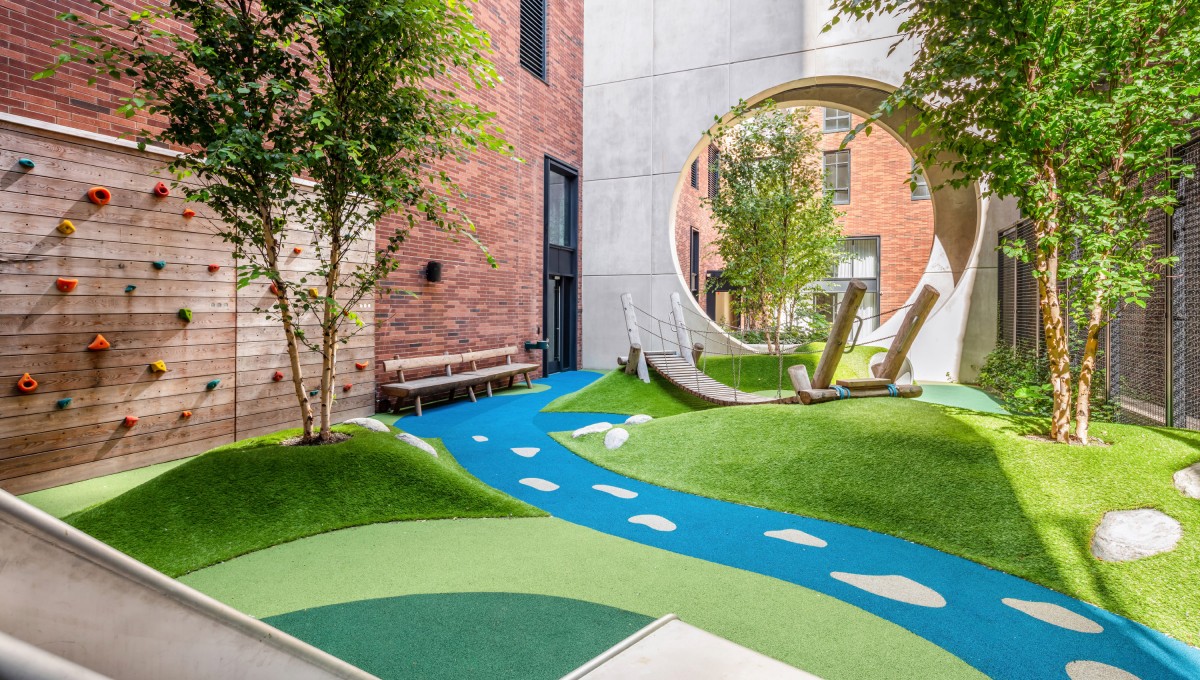 The building is elegantly rendered in brick, limestone, steel, and bronze, classic elements interwoven with contemporary details. Oversized windows are a key element in the facade design, which focus on maximizing views and minimizing obstructions. The four full exposures and prominent urban corner create a unique design opportunity. The tower is recognizable from all directions and features metal and glass "lanterns" at the top of the building. When viewed at night, the lanterns lend a unique character to the building. Generous floor plans complement a unique suite of amenities, including a pool and New York City's first residential music studio space.