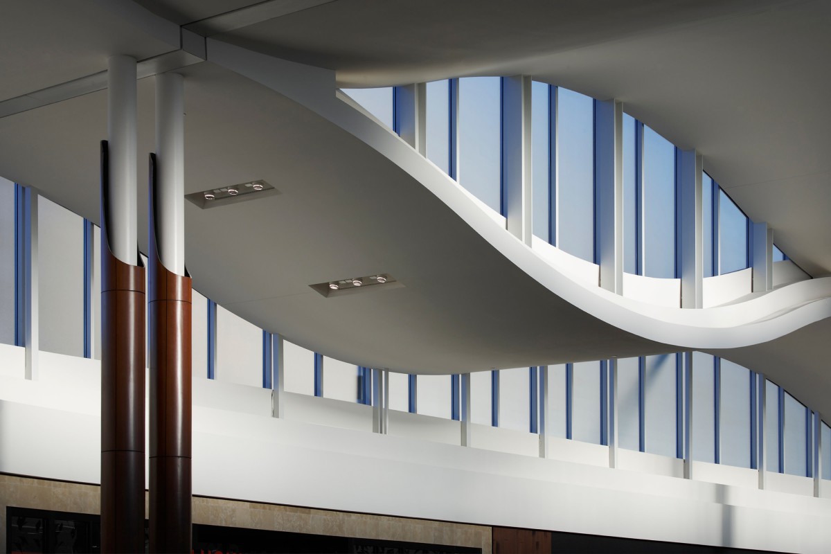 BBB has transformed The Natick Collection, a well-known Boston-area shopping center that first opened its doors in 1966, into a dynamic and architecturally significant, high-end retail environment. In addition to renovating the existing facility, BBB incorporated 100 new stores and 550,000 SF into an overall development that also includes luxury condominiums and below-grade parking. Natick, a Native American word loosely translated as "Place of Rolling Hills," provided inspiration for a design that incorporates a softly undulating arcade ceiling with curved clerestories and expansive skylights that filter in natural light. Large-scale custom porcelain tile in circulation zones, accented with curved patterns, evokes the richness of stone, and wood flooring on the second level provides an unexpectedly high-quality finish for a retail environment. To further animate the interior, landscape artist Martha Schwartz created a series of transformative vertical elements consisting of hanging canopies of colored metal leaves floating over groves of abstracted birch stalks.