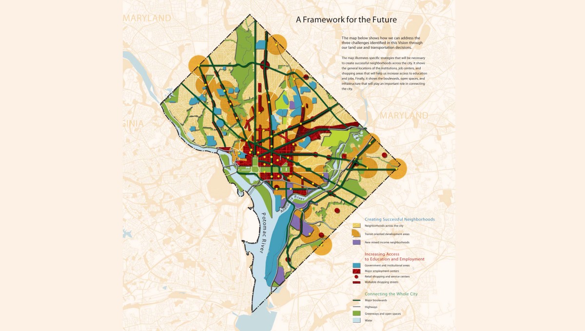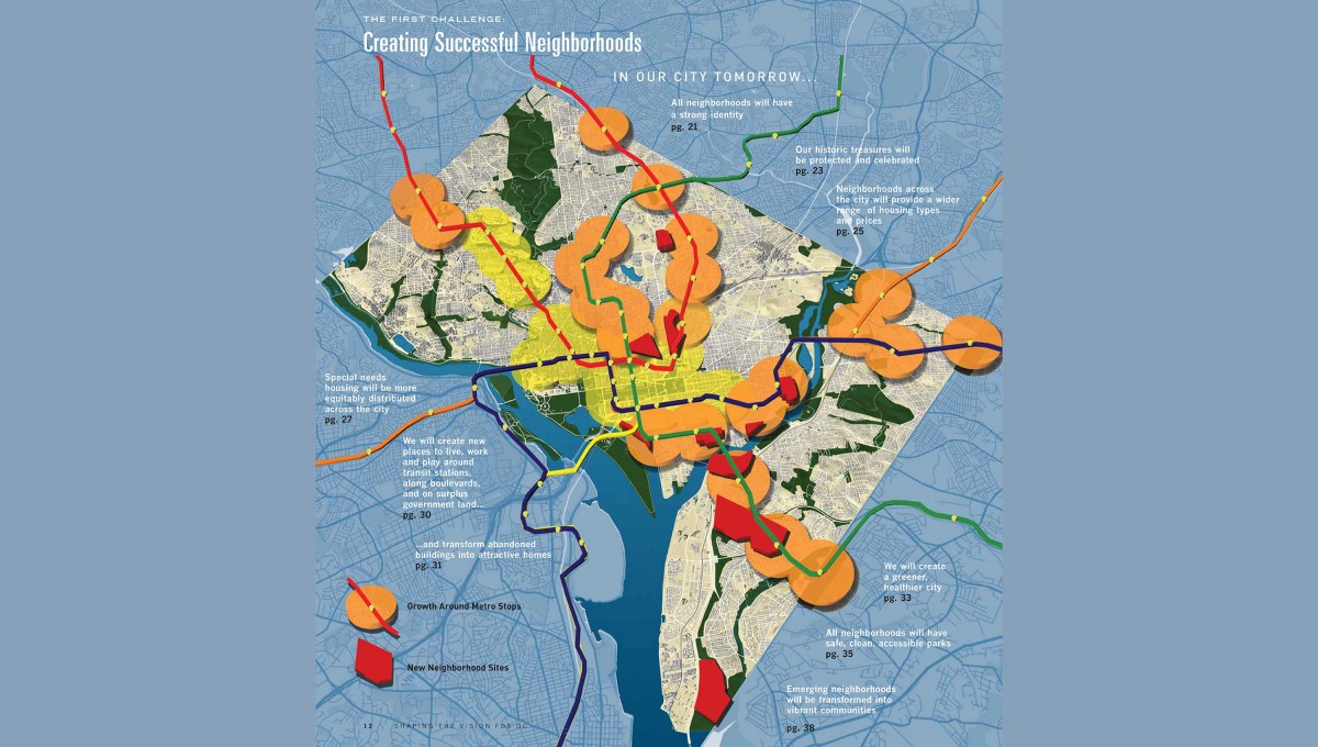 Working with the District of Columbia Office of Planning and Mayor Anthony Williams, the "Vision for Growing an Inclusive City" creates a vision and policy framework for the entire city, focusing on bridging social and physical divides and utilizing a highly participatory public engagement process.