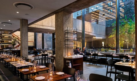 Set on the lower level of The Met Breuer overlooking the sunken garden, the restaurant features a design that respects Marcel Breuer's modernist vision while also incorporating a contemporary aesthetic. A palette of wood, leather, and bronze — finished simply and elegantly — complements and softens the museum's robust concrete and bluestone interior.