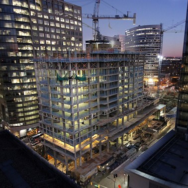 In our first installment of “In Construction,” a new series that explores behind-the-scenes building technologies and methods, we take a look at Central Place* and three unique aspects of the project: the challenges of building within and connections around a transit hub; capitalizing views atop Metro DC’s tallest building; and the James Carpenter-designed lobby.