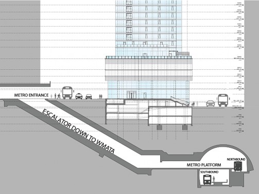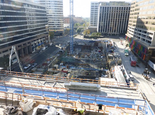 Central Place is located in the center of downtown Rosslyn directly across from the Rosslyn Metro, where three train lines, local bus routes, interstate buses, and bike share programs intersect and form one of the busiest hubs within the Washington DC metro area. The bedrock between the Metro and Central Place provides adequate support for the site and eliminated the need for reshoring of the structures. However, seismic monitoring equipment was used to detect any impact of the bedrock blasting on the active WMATA station structure.